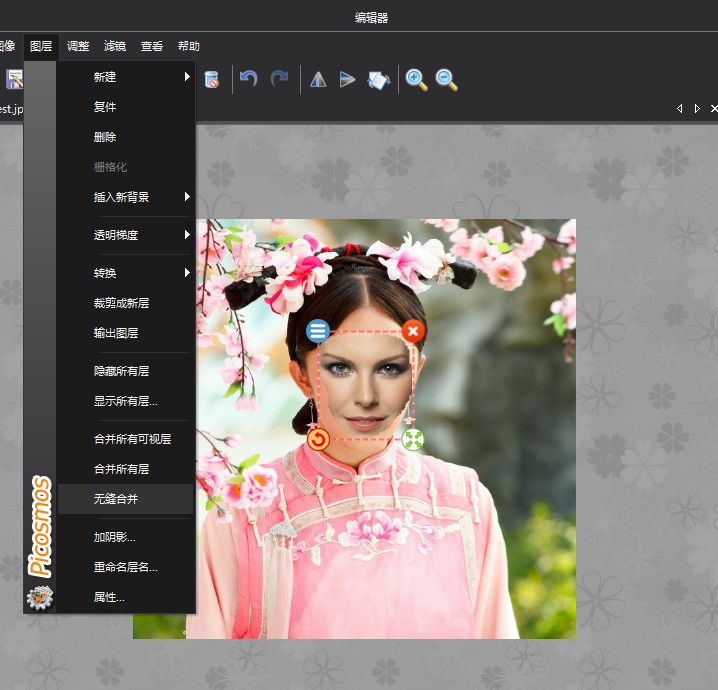 打开图片,并复制脸部到另一张图片上,选择菜单图层--无缝合并