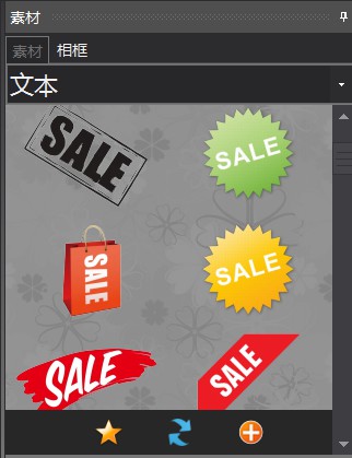 材料:弹出材料选择框,您可以将材料中丰富的内容添加到您制作的图片中去,材料现在包括会话气泡、爆炸脸部、食物、水果、化妆、飘带、文本、旅游、蔬菜、天气等素材