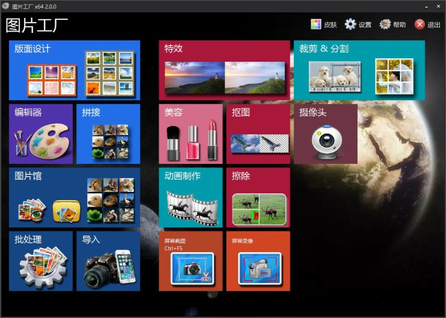 功能区包含版面设计、编辑器、图片馆、屏幕截图、屏幕录像、特效、抠图、拼接、裁剪&分割、批处理和摄像头等功能