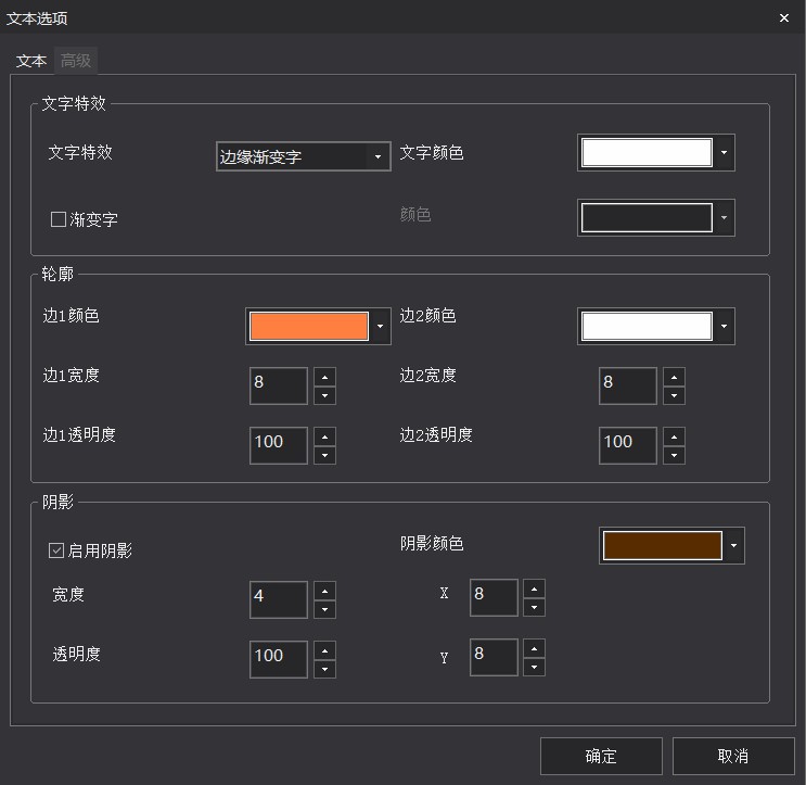 轮廓:调整文本轮廓的颜色、宽度和透明度。双边字和边缘渐变字会激活边2,边1为内边,边2为外边